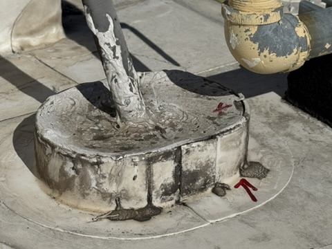 Commercial flat roof showing moderate wear. Primary concerns: standing water at Bay 3 indicating drainage issues, membrane failure at Section A requiring replacement, and flashing separation along the north parapet.